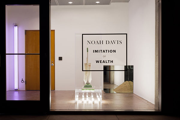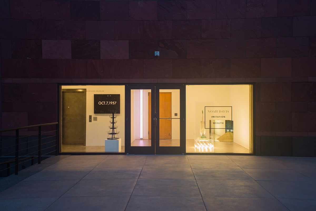 In Imitation of Wealth, Davis stations a vintage Hoover vacuum cleaner (bought via Craigslist) atop a vitrine filled with fluorescent lights, making an identical Jeff Koons. He replicates a Robert Smithson in the corner of the room, with three square mirrors embracing a pile of sand. The iconic works of Marcel Duchamp, On Kawara, and Dan Flavin are also re-created. In an interview with Art in America, Davis explains his initial interest in showing the works at the Underground Museum, which formerly housed a pupuseria: “I like the idea of bringing a high-end gallery into a place that has no cultural outlets within walking distance.” Now relocated to MOCA’s storefront, Davis’ copies of these iconic works are glassed in by floor-to-ceiling windows. The room is inaccessible; its front door is locked. Visitors can only view Davis’ works from the exterior, by squinting through the reflections in the windows, and are disconnected—kept out—from the works inside.