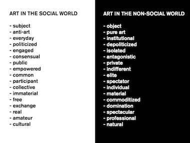 With this formulation, we argue that the non-social world has been separated from the political, the everyday, and emancipation. It has become a space of the elite, of indifference and isolation, and perhaps even of complicity. Even more troubling is that, inside the non-social world, these relationships between commodities, individuals, materials, and institutions are naturalized—presented as though they are not constructed. The social world is its opposite, a realm of emancipation through collective, political, and public engagement. However, once we separate a non-social world from a social one, a series of contradictions clearly emerge. For example, we cannot ignore in this formation that within the art-in-the-social-world pole, antagonism is riven from politics. Moreover, that the institutional could coexist on the same pole as the natural, or that material could somehow be separated from exchange, speaks to the insufficiency by which a binary or subject-only position can give an adequate picture of the social. Similarly, that the constructed could be properly situated on the opposite end of the pole from the cultural suggests not only a fundamental fluidity between categories but indicates as well the arbitrariness of their divisions in the first place.