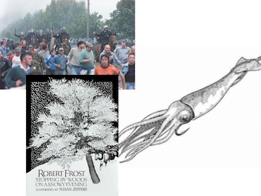 Slide from "The Social Beyond Anthropocentrism” panel presentation, Valand School of Fine Arts, Göteborg, Sweden. Images: Still from Recreation of the Battle of Orgreave (2001) by Jeremy Deller; illustration of a giant squid; Stopping by Woods on a Snowy Evening by Robert Frost.