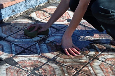 Yasin’s most recent video, The Imaginary Houses of Palestine (2010), engages with the concept of deterritorialization. In The Imaginary Houses of Palestine, Yasin scrubs grout on the filthy tiles outside of a decaying house, until eventually they are clean. Ornate patterns emerge, and the history of the site is revealed. As the artist performs this act, she recites the text of an interview she conducted with herself from within the ruins of a Palestinian house. The building in the video has no identifying marks to designate location, but the performance, in fact, occurred in the Potrero Hill section of San Francisco. The tiles are likely an import from Latin America and may possibly represent the centuries-old Arab influence from the Moors. This act of removing one layer of history to uncover another is not explicitly tied to a specific geographic site, instead evoking displacements that occur everywhere.
