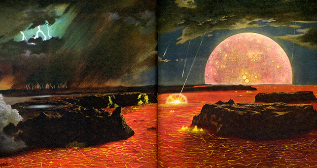 "Rivers of molten stone flow across the earth as lava erupts to the surface through weak points in the cooling crust," in The World We Live In Volume 1: The First Four Billion Years (New York: Time-Life, 1963).