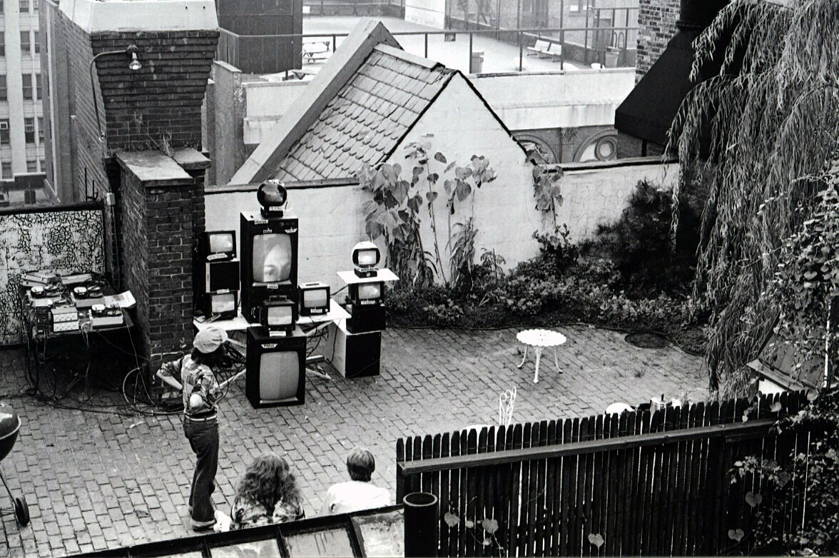 The readership generated from Clarke’s earlier cinéma vérité films differs significantly from the readership of the videos produced by her Tee Pee Video Space Troupe, an early video-art collective, which emphasized real-time experimental video screenings in the form of workshops that depended on participation. Participants would work through the night, spread out across different levels of Clarke’s penthouse studio, utilizing live feeds and Portapaks to create videos that would be screened simultaneously at dawn. A photograph held in the Troupe’s online archive, depicting a rooftop sunrise screening hosted by the collective, taken from above, shows a fragmented New York City skyline. To the right of the image, a wooden fence emerges from an abundance of greenery and vines, while to the left a number of cords lead to a small table with recording devices and power outlets. The triangular peak of the hotel’s façade is central in the picture’s composition, flanked immediately to the left by several variously sized cathode-ray-tube (CRT) TVs arranged upon and around a white table. Clarke is standing in contrapposto, hands resting on her hips, and slightly to the left of the TV monitors so as to not to block the view of others gathered in chairs behind her.