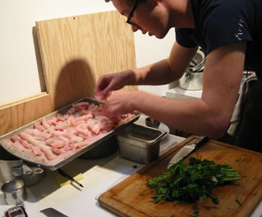 On an evening in early fall 2010, Ake was preparing to cook a five-course meal for a group in a small Dogpatch loft. In his prep area, with blue painters tape, he had affixed two copies of the evening’s menu—neatly printed on cream-colored paper and reminiscent of Joseph Beuys’ fat-smeared list, Food for Thought (1977).
