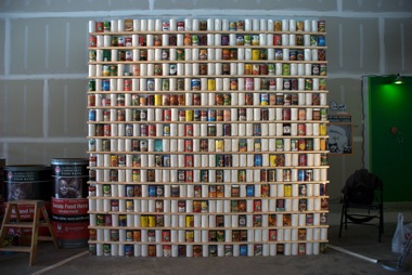 Jay Dion. Untitled (Cans), 2009; ceramics, wood, canned goods; 8 x 8 ft. Courtesy of the Artist.