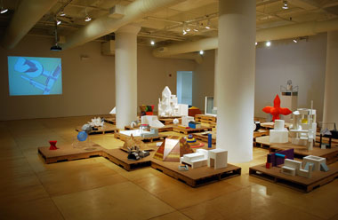 Stephanie Syjuco. Particulate Matter (Things, Thingys, Thingies), 2010; installation view at Gallery 400, University of lllinois, Chicago; over seventy handmade objects based on ‘shared’ designs sourced from Google SketchUp and accompanying digital video projection; overall 35 x 30 x 6 ft. Courtesy of the Artist and Catharine Clark Gallery, San Francisco.