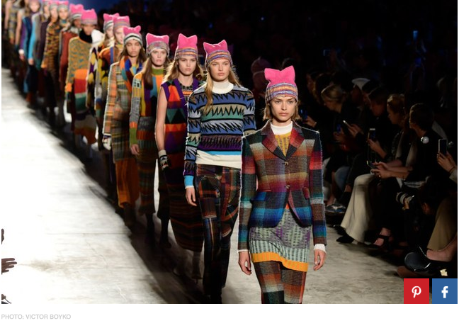 Models walk the runway in pink pussy hats for Missoni at Milan Fashion Week. Photo: Viktor Boyko. (Source: http://www.glamour.com/story/missoni-pussyhats)