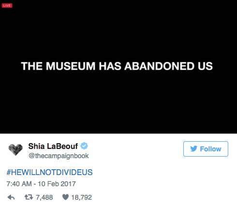Many public institutions supporting the arts and historical preservation (including a few mentioned above) operate under the classification of a 501(c)(3) tax-exempt educational organization. This can mean various things about their funding structures, but unilaterally precludes them from political endorsement. The code reads in part, “Under the Internal Revenue Code, all section 501(c)(3) organizations are absolutely prohibited from directly or indirectly participating in, or intervening in, any political campaign on behalf of (or in opposition to) any candidate for elective public office.” While this seems to have precious little to do with artwork acquisitions or project support, the code has recently been cited as a thinly veiled conflict of interest by a board member of the Museum of Moving Image in New York in response to her hesitation over a recent exhibition. He Will Not Divide Us, a project by celebrity actor Shia Labeouf and artists Nastja Säde Rönkkö and Luke Turner, was touted to be a four-year long livestream of verbal resistance to rumored incoming presidential policies. In manifestation however, the livestream (with its equally neutralizing title as rallying slogan) was relatively innocuous. A statement of resistance in this case signified the resistance to national division. Whatever its conceptual strength, the museum discontinued the installation on February 10, 2017, and museum trustee Claire Shulman was quoted saying: “I was upset when I found out about [the installation]. It was a mistake to do it. It’s unsafe for a public institution to do a project like this. It’s inappropriate for the location. It’s a city building. It’s a city institution. It’s one of the finest institutions in the city."1 Shulman noted the museum’s tax-exempt status and expressed concern over artist projects alluding to partisan politics. This is one of several instances of such squeamishness in the past couple years. In September of 2016, Contemporary Art Museum St. Louis curator Jeffrey Uslip declined to participate in political conversation around his contentious exhibition of artist Kelley Walker, whose work appears to many to trivialize the terror that people of color experience under systematically oppressive police actions. Uslip subsequently resigned.2 Critics contend that our museums and the administrations that guide them only adopt political gestures when the stakes are low, when the institution won’t be expected to contextualize these gestures, or when celebrity involvement brings the endorsement of popular attendance and media praise.