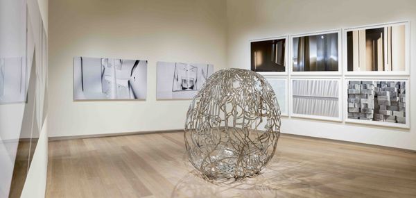 (from left to right) Franck Abd-Bakar Fanny. Another Day without You, 2013; five C-prints mounted on disec; 39.5 x 70.75 in. each. Ghada Amer. The Blue Bra Girls, 2012; stainless steel; 72 x 62.25 x 54 in. Lamia Naji. Immaculé, 2011; six C-prints mounted on Dibond; 45.25 x 61 in. each. Courtesy of SCAD Museum of Art, Savannah. Photo: Marc Newton.
