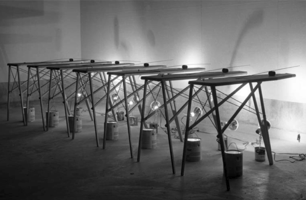 Much of the art in the show looked as if it was still in progress, and some of it was. Wayne E. Campbell made a latex room titled Table the Problem. Melchert’s piece consisted of a sheet of Plexiglas covered with water drops and, later, money (put there by others) suspended over the heads of viewers “like a clear and flat wishing well.”4 One of the most elaborate installations was Fried’s Return of the Agrarian Society, made of seven ironing boards representing the seven continents and real vegetables dipped in phosphorescent paint, which glowed when a light turned off every twenty minutes. The vegetables were suspended on rods cantilevered off the boards in such a way that their projected shadows made a map of the world on the wall. Fernie made a formal garden of chrysanthemums. Laub constructed a wood and canvas tower that extended to a hole in the roof (a kind of proto–James Turrell sky room). Warner Jepson, anticipating a future in which direct experiences of nature would be rare, provided a blue space in which visitors could listen to bird sounds on headphones. Henderson planned a sixteen-screen projection showing farm workers, minority communities, and other groups who were beginning to organize, but his ambitions exceeded the available technology. Wiley, ever the optimist, contributed a watercolor depicting a slingshot in the form of a peace symbol and a wooden box from which his faint, tape-recorded voice repeated over and over, “This is the eighties, this is the eighties.”