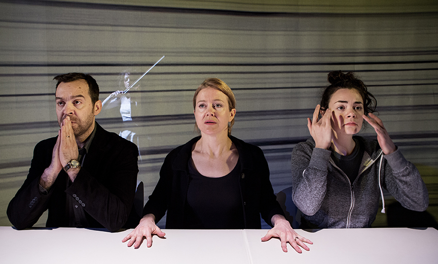 Andrea Tyniec, Paul Braunstein, and Amy Rutherford in Infinity. Courtesy of Tarragon Theatre, Toronto, Canada. Photo: Cylla von Tiedemann.