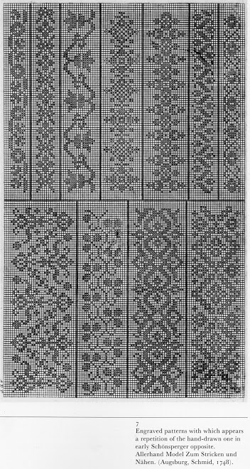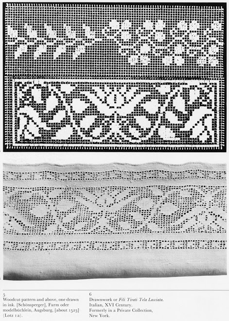 Beginning in 1523, with a volume titled Furm oder Modelbüchlein (“Form or little pattern book”) by Johann Schönsperger the Younger, print shops throughout Germany, Italy, and France began to publish patterns for lace and embroidery.14 Seen in a later book, from 1529, the crosshatched background of certain Renaissance etchings inspired Schönsperger’s major innovation, “the idea of presenting his woodcut designs in black against a background of black-and-white cross-hatching.”15 In other words, he adapted the print matrix to the fabric’s warp and weft, generating codes suited to the newly schematized methods of textile production.