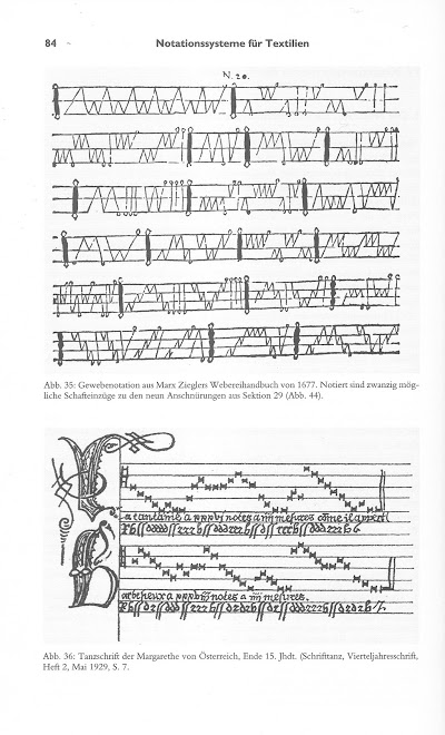 Page 84 from Birgit Schneider, Textiles Prozessieren: Eine Mediengeschichte der Lochkartenweberei (Zurich and Berlin: Diaphanes, 2007). Top: weave-notation figure by Marx Ziegler, Webereihandbuch (1677). Bottom: dance-notation figure by Margarethe von Österreich (late 15th century).