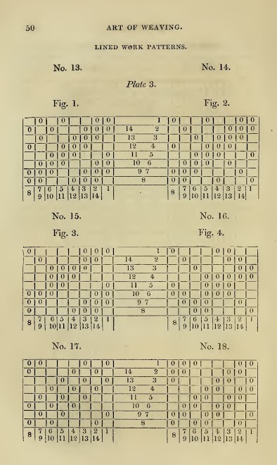 Consider an example: a page of weave drafts for twill patterns, from the Treatise on the Art of Weaving, published in Scotland in 1827 by a certain John Murphy. Identified as patterns, figures, and numbers (subsets), such illustrations ostensibly managed the activities of a population of divided textile-factory workers: those who tied up the loom and those who shuttled the weft. These images were part of a system that abstracted the conditions of labor by making it more efficient.