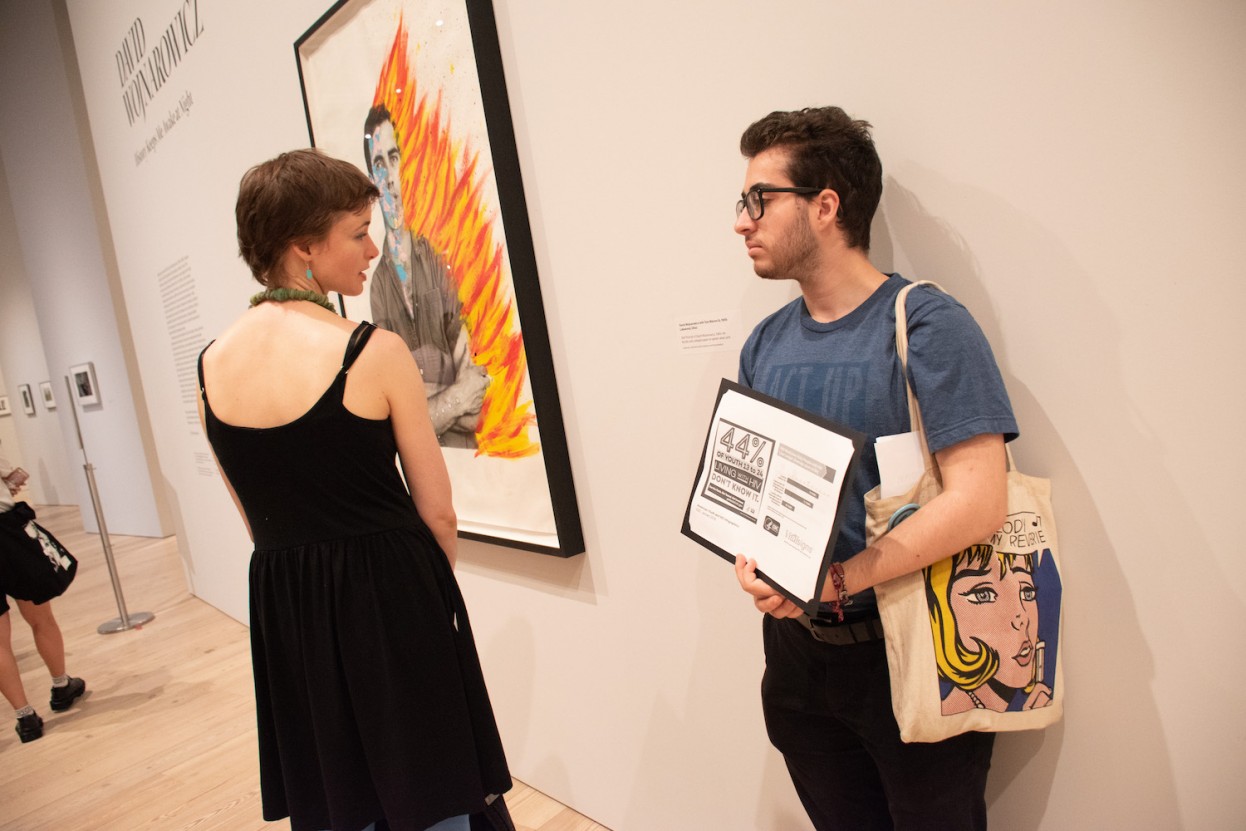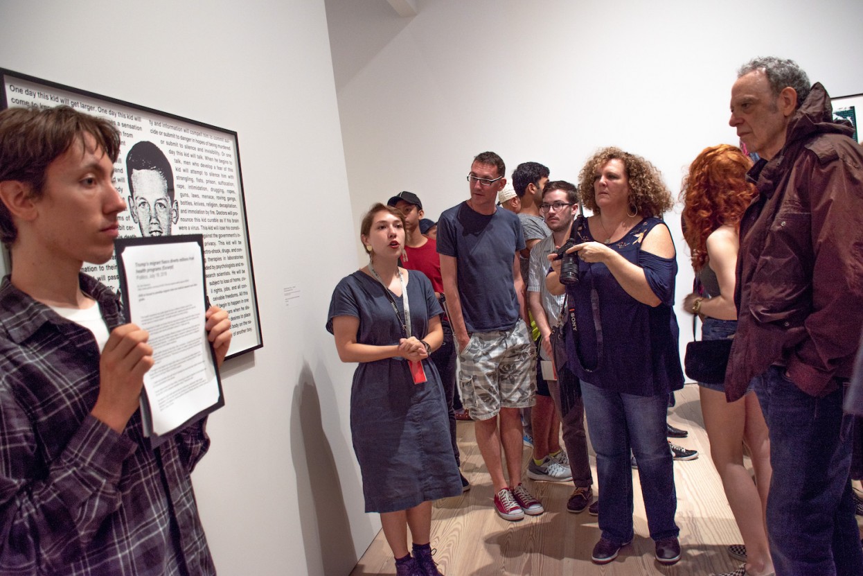 The action involved protesters holding up recent articles and statements from publications like The New York Times, The Guardian, and The Washington Post, designed to resemble exhibition text and wall labels, next to specific works in the exhibition, connecting Wojnarowicz’s art and legacy to the present-day: “AIDS of the past” becomes “ongoing AIDS.”6