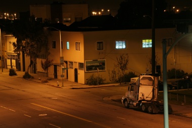 In December 2008, Michael Damm projected a series of videos onto windows in the project space, as well as the living area because they offered the best vantage points from the street and the passing trains. The videos ran for 10 consecutive nights, during the darkest time of the year, from about 5 to 9 p.m., overlapping with the heaviest commute hours. Consisting of images from various locations in Oakland, the work reflected the visually rich experience of navigating the city, when one is only half aware of their environment and is en route to somewhere else. This piece, titled incidental films for an accidental audience (2008), played upon the visibility of the building and its windows from a distance; the videos were visible to passing trains, from the train platform itself, to passing cars and neighborhood pedestrians. This accessibility reflected on the nomadic features of contemporary communities as the work was visible to West Oakland residents and to everyone in transit. It also interrogated the public and private aspects of the space by co-opting the windows for use as an alternative venue, projecting outward when windows are typically covered for privacy and inviting attention to the building from every direction.