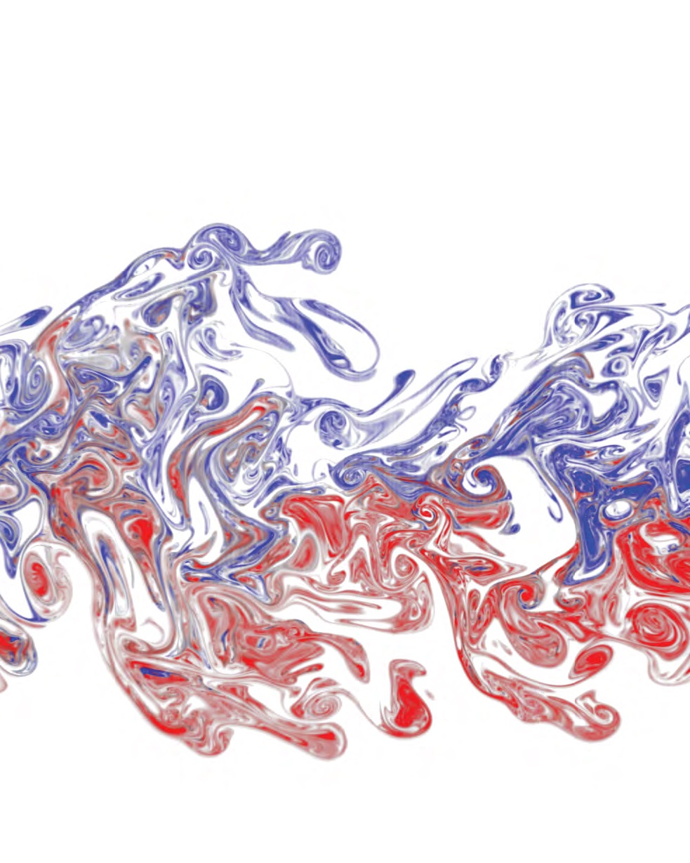 Laser-based experimental visualization of two interacting odor plumes (red and blue) transported by a turbulent flow. The spatial and temporal patterns in the plumes likely embed information about the distance and direction to the source of the odorant. The false-color image is created using a two-channel, planar, laser-induced fluorescence (2C-PLIF) system developed at the University of Colorado. Courtesy of Mike Soltys and John Crimaldi, University of Colorado.