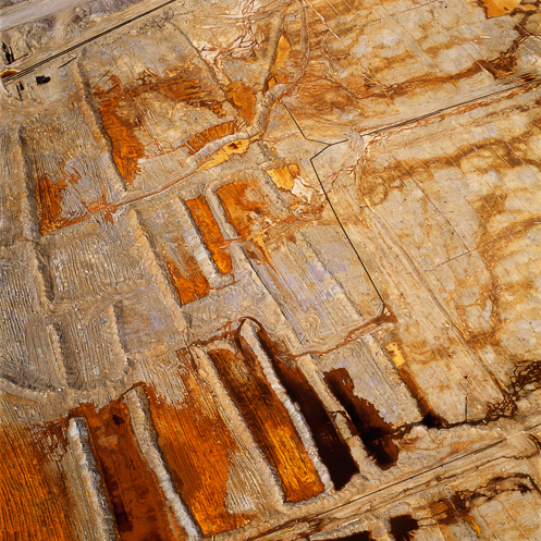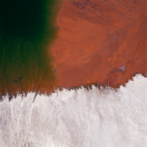 Maisel shoots his photographs from above while he is strapped into a banking plane, resulting in the felicitous effect he describes as “lock[ing] out the sky,” a reference to the Modernist photographer Frederick Sommer, one of his key influences.1 In this position, Maisel says, “shapes and forms don't exist per se. They exist in that moment.” As he shoots, the steep, wide angle of view, the absence of a horizon line, and his shifting position, all rob the space of its identity. Maisel composes the images in a square format, leading to what he calls “compaction,” which, by defying the conventionally horizontal orientation of landscape imagery, heightens the works’ abstract qualities. He does not manipulate color, he says; he manipulates “tonal field.” But the actual colors of mine tailings—lakes of chemicals in water—are otherworldly enough to be confounding.