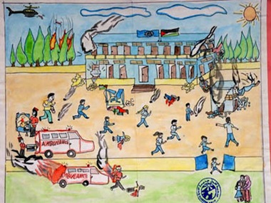 The exhibit consists of twenty-five to thirty drawings made by children who lived through Israel’s military operation in Gaza in the winter of 2008-09. Like other drawings of war by children from Iraq, Chechen, Indonesia, Darfur, and Theresienstadt, these pictures depict awful things: bombs exploding on living spaces, eviscerated buildings, tanks firing on civilians, and people bleeding and dying in the street. But seen up close, their materiality, scale, and mark-making also look devastatingly familiar. They are like the drawings our own children make—untrained, but frank, searching, and immediate. The recognition that at the level of touch and responsiveness to a lived-in world, these drawings are like the ones on our refrigerators and in our family scrapbooks brings a terrible contradiction into view. The children who made them are as alive as we are, but their testimonies and existence are shamefully precarious in our current political landscape.
