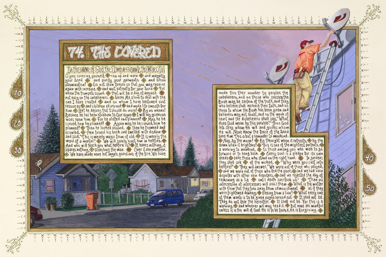 Yet Birk’s adaptation portrays American people engaged in the most mundane activities—from doing laundry and working in fields to teens washing cars—which are juxtaposed with the 114 suras, offering up a picture of our society that is at times humorous, and often at odds with the exquisite rendering and illustration of the text. One such example is Sura 15 (2010), in which we see huge trucks driving in mud, and two potbellied men at one side photographing the event; a second panel portrays people picnicking in an RV park and campground. Among the images featured in this show, one of the most ironic and touching is Sura 74 (2010), in which a workman atop a ladder installing a satellite dish is juxtaposed with text that states, “But none are mindful unless it is the will of god,” suggesting that when god is “channeled” into our living rooms, things might improve.