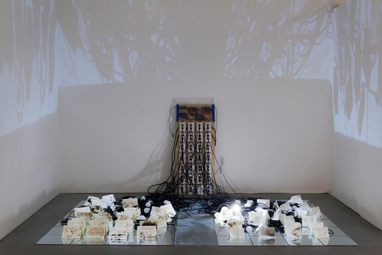 Summer Mei-Ling Lee and Laura Boles Faw. An Atlas of the Invisible, 2018; multimedia installation (electronic outlet board, lights, video projection, and handwritten letters written with invisible ink. Additional technical programming by Melanie Piech.) Photo: the Artists, AKArt, and re.riddle.