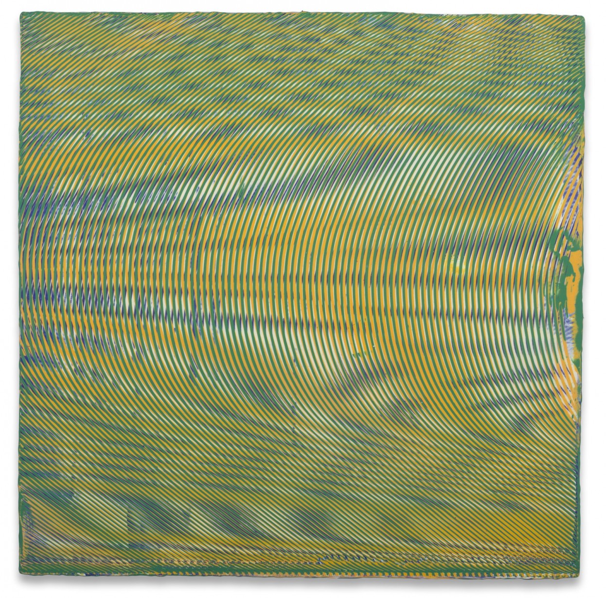 Survey 2013P-34 from afar and it resolves as moiré. Dissect it up close and it dissolves into painted lines and arcs. Experience it from the middle distance and pattern and paint coexist: green over yellow over purple—fading at times to blue—over white. The combination of green and yellow arcs on the right side of the painting, which form the top layer of the moiré pattern, at the same time insist on their independence from it, gathering strength halfway up the canvas before escaping its top edge. Green and yellow lines form what appears to be a scrim overlaying a background—horizontal bands of yellow and vertically inclining ones of green—that recedes into the distance like sunlight and shadow on water. Purple, its bluish shadow, and white sound grace notes throughout the painting, subtly enhancing these perceptual experiences. Other Faruqee paintings act differently, but all produce this dynamic of depth, breadth, and layering that reads as both moiré and not-moiré. The canvas is barely able to contain these multiple activities.