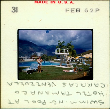 the upside-down inscription, “Swimming Pool at Hotel Tamanaco Caracas Venezuela.” Vacation slides! There must be millions out there from the pre-digital universe, but why were they created and where do they reside after owners’ deaths? In a culture that is increasingly concerned with people’s histories (no more master narratives) and tourism (a new and old economic engine), there should be a national depository for vacation slides, family photos, journals, and diaries. Dee Hibbert-Jones’ Burden of Nostalgia (2002), a suitcase filled with ephemera including a notebook marked “Mission High,” raises these same issues.