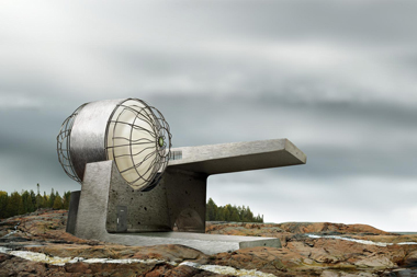 With titles like "Micro Re-Instigator" (2009) and "The Radiant Proliferator" (2009), Trautrimas not only reinforces his images’ science-fiction and cold war aesthetic, but provides a narrative about the functionality of the building itself or the covert operations that may occur within. Unlike traditional architecture that viewed the structure as a shell into which building operations like heating, plumbing, and electricity were discretely inserted, his titles and structures hypothesize a hybrid of machinery and architecture, not unlike the new, heavily engineered San Francisco Federal Building and California Academy of Sciences.