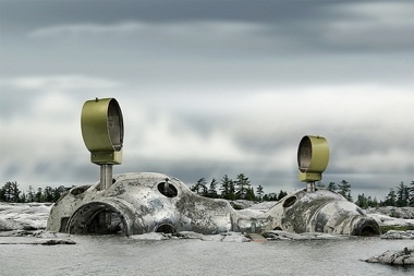 Trautrimas photographed landscapes associated with the Cold War across North America to serve as backdrops for The Spyfrost Project. They include images of the Manhattan Project area in Los Alamos, New Mexico, and a network of radar stations in Ontario, Canada. Having documented these “real” landscapes, Trautrimas then worked to monumentalize various artifacts of consumption from the Cold War period. He pulled apart and photographed an old record player, refrigerator, heater, and a few microscopes, then superimposed these abstract parts as military structures within the landscapes. This deceptive digital technique proves only mildly realistic, but the significance of his painstaking work is its strained cohesion, not its accuracy. The austerity of warfare and the conflicted ideology of a free-market economy are embedded in these pastiches of time and place. The patinas of the finished photographs are extraordinarily beautiful and compelling. Although the Cold War has concluded, Trautrimas suggests that its symptoms persist into the 21st century.