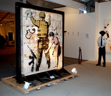 Banksy Out of CONTEXT was shown at CONTEXT Art Miami, a new offshoot of the long established Art Miami fair that runs concurrently with Art Basel Miami Beach. The show featured cutout murals taken from Bethlehem, Los Angeles, San Francisco, and the United Kingdom. The stencil paintings on stone and concrete reportedly weighing between one and three thousand pounds each were displayed behind velvet ropes flanked by security guards. These same works were for sale in the $450,000 price range at a 2011 Southampton show also by Banksy Out of CONTEXT organizers Stephan Keszler (Keszler Gallery) and his collaborator Robin Barton (London’s Bankrobber Gallery). However, since the handling service and interlocutor, Pest Control, refused to authenticate the works due to their objection to removing it from the street in order to sell it, buyers stayed away. Issues of site specificity and property rights aside, for Banksy to admit authorship would be a confession to criminal activity. Additionally, in deference to both Banksy’s and Pest Control’s positions on these issues auction houses such as Sotheby’s, Christie’s, and Phillips de Pury do not auction this street artwork.