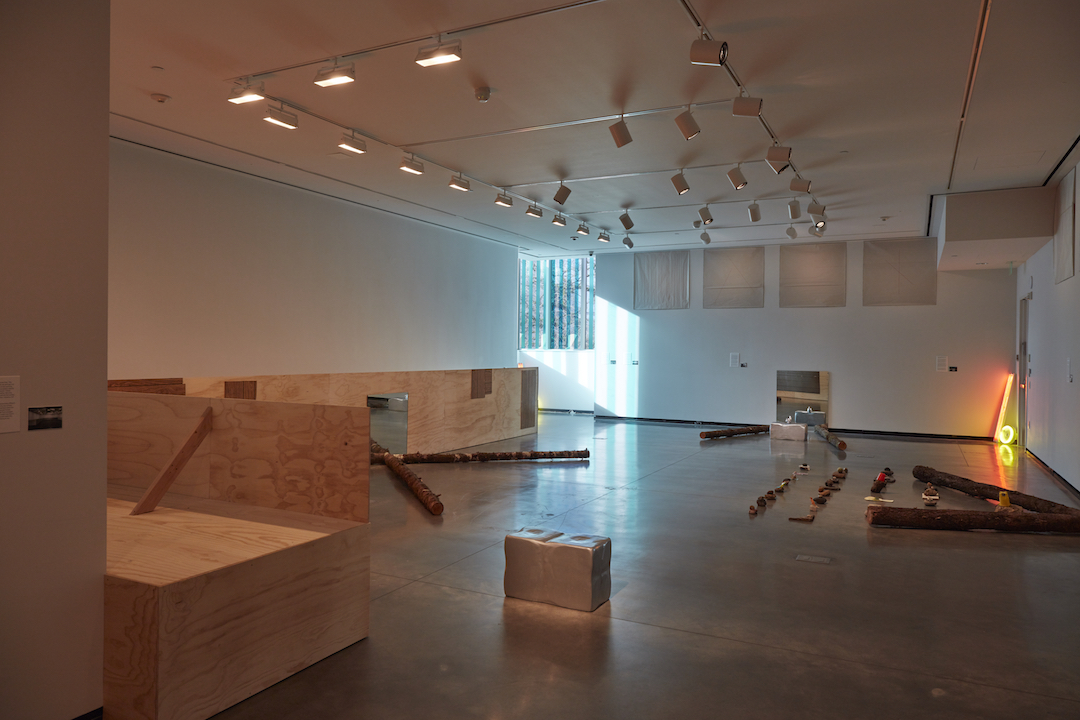 The exhibition is split between two PCVA institutional “acts”—as Triple Candie calls them—the 1970s and 1980s. In the exhibition’s first chapter, Triple Candie creates surrogates, or unfaithful reproductions, that approximate and parody the work of artists featured at PCVA in the 1970s. Viewers are surrounded by works that reference sculptures by Donald Judd, Richard Serra, Robert Morris, Dan Flavin, and Daniel Buren, whose site-specific, minimalist exhibitions often foregrounded an assumed white male viewer/body, and whose work dominated PCVA’s early programming under the direction of Mary Beebe. Triple Candie’s interventions query their relevance through curatorial theatrics of approximate restaging and material undermining. For instance, Triple Candie read Richard Serra’s 1975 Unequal Elevations, composed of two 1,500-pound steel blocks of differing heights set 80 feet apart in the gallery, as a grand spatial domination. The duo topped their lighter, wooden version with a silver phallic gourd—an unfaithful yet incisive encore.