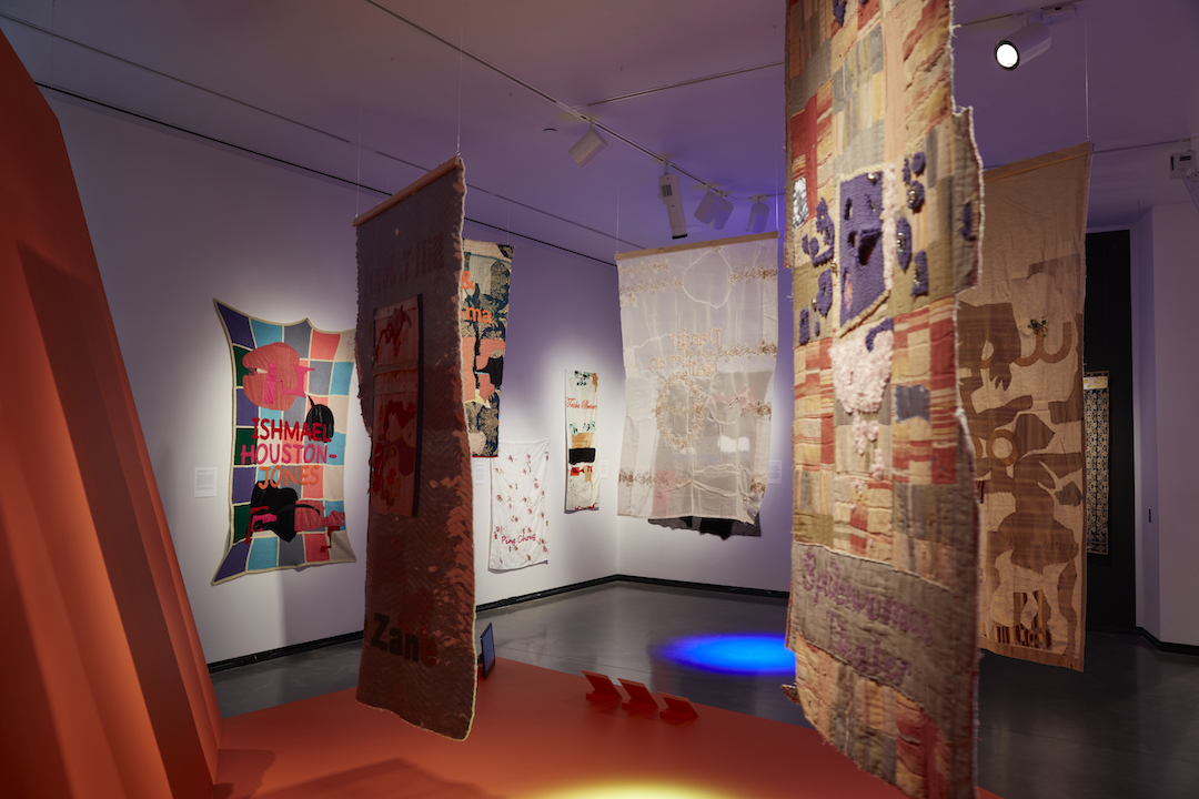 As funding sources fluctuated in the 1980s, PCVA’s programming steered toward time-based media and durational performance. In lieu of video or photographic documentation of these performances, Triple Candie salvaged ambiguous textiles in seemingly heraldic banners presented alongside stop-action animations. Processional and yet static, the banners commemorate ephemeral works by Meredith Monk, Eiko & Koma, Bill T. Jones, Spiderwoman Theater, Laurie Anderson, and more. Their distance and simultaneous intimacy unveil the farce in nostalgia and the reality of the “unknowable past.”