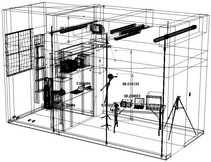 While a viewer becomes a spectator of his or her own performance through the monitor and oscillator, there is yet another distancing effect: amidst the monitoring equipment, a computer rendering of the gallery’s interior rotates on a laptop, and flickering dots assemble and disperse in the virtual gallery. Like panoramic views of hotel rooms or the traversable space of video games, what else is needed to perceive this immersive illusion besides the disembodied eye cultivated by still-life painting? As Brian O’Doherty (a.k.a. Patrick Ireland) writes in Inside the White Cube, “[T]he Spectator and the Eye are conventions which stabilize our missing sense of ourselves. They acknowledge that our identity is itself a fiction.”1 The mediations themselves—as well as a viewer’s internalization of their significance—become ways of building fictive self-identifications.
