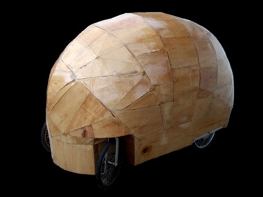 Jay Nelson. The Golden Gate 1, 2009; bicycle parts, luan plywood, hardwood, pvc pipe, fiberglass and resin, glass, silicon, canvas, foam pad, kitchen material, 5'6" x 4'6" by 7'6". Courtesy of the Artist and Southern Exposure, San Francisco.