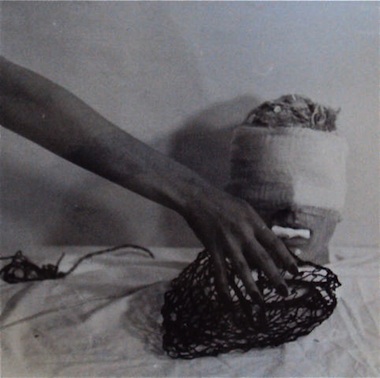 Despite the macabre content—castration, subjects wrapped in gauze, bloodstains, a dead chicken, etc.—Schwarzkogler’s photographs are gorgeous. The reason for this is that while the other artists associated with Viennese Actionism performed in front of audiences in order to employ chance and thus “keep it real,” Schwarzkogler staged performances in his apartment so he could control situations and capture them photographically. The result is all artifice: clinical, meticulous scenes that could pass for high-fashion ads. The fact that all the images are in black-and-white furthers this clinical and fashionable aspect; all the potentially disturbing elements appear less as subjects of pain and loss and more as aesthetic objects. The rest of the photos’ stage props (rope, nets, razor blades, tangled wires, plaster balls) lend themselves to this aesthetically driven concern for balance and control. They appear carefully considered and positioned alongside, on, under, and in the models, who, young and attractive, with makeup and striking poses, also look unrealistically pretty.