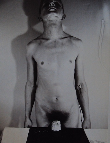 Rudolf Schwarzkogler. Untitled, Aktion 4, 1965; silver gelatin print, 13.5 x 13.5 in. Courtesy of Steven Wolf Fine Arts, San Francisco.