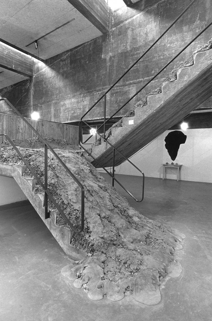 First conceived for a 1987 exhibition at SFAI and re-created here on the same staircase, Ireland’s Smithsonian Falls, Descending a Staircase for P.K. (1987) is a mudslide of concrete poured down the stairs between the gallery’s second and first floors. As in the original installation, the thick liquid concrete is allowed to follow its own course, pooling and then solidifying on the stairs, rendering them inoperable. Invoking site-specific works by Robert Smithson, such as Asphalt Rundown (1969), Ireland moves beyond Smithson’s idea of “entropy made visible.”2 In Smithsonian Falls viewers are denied easy access to the works on the second level of the space because of the action on the stairs, forcing them to confront the futility created by entropy.