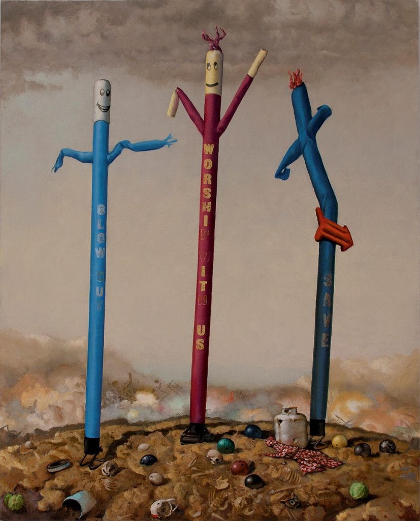 In frightening and amusing ways, Greene asks viewers to look upon the devastation of a dark, corroded dystopian future in which the natural world is decimated by humankind. In Trinitas (2015), three inflatable tube men (of the kind one sees dancing in the wind at used-car lots), dominate a landscape of cloudy smog, fog, and dirt. Uncanny phrases such as “Worship with us” line the sides of the tube men and draw viewers into a hopeless and barren landscape punctuated with the remains of man-made structures, rotten bones, and colored bowling balls. In Greene’s paintings, we are our own undoing.