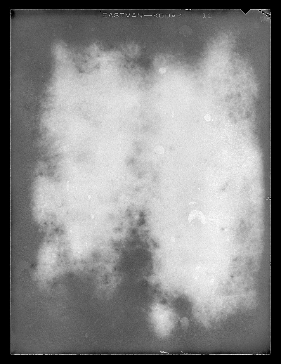 In fact, “nothing” is photographed here. Developed from an unused box of expired Eastman Kodak sheet film from 1927, the series documents how film stock distorts when exposed to inconsistent environmental conditions and, more importantly, time. The materiality of film is the primary focus here, and as such, it would be all too easy to dismiss the series as an interesting formal exercise without a clear “subject.” Oakes certainly challenges notions of authorship by printing unused film stock that, arguably, has not been activated (or used) by the artist’s camera. However, Oakes uses this diffuse quality to raise larger questions about the intended use of artistic materials. In aestheticizing the random distortions effected onto this film stock, Oakes shows how time marks material substances with a distinctive presence. At their most basic, the prints on view depict images of deteriorated film stock, but distinctively abstract, they also represent how temporal and environmental conditions invariably leave both a literal and metaphorical stain on physical objects long after their original place and time of use.