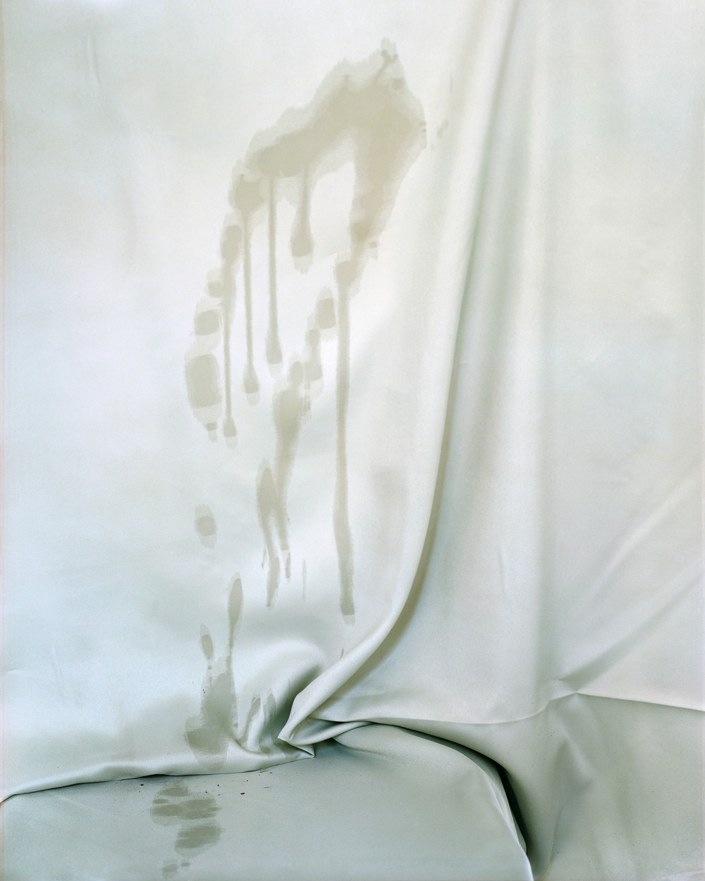 The fine sheen of the fabrics that Oakes depicts, however, is often soiled. Violently strewn grease marks cover the pastel peach satin of PL8215 (2014), splattered against the fabric as if from a projectile spray from an exploding bottle. Similar stains spread out against the cerulean satin-sheen fabric in PL3360 (2014), the oily smears dripping slowly along the fabric’s folds in rough starts and stops, over-stains covering older marks to produce subtly gradated smudges and spots. The juxtaposition of erratic stains against soft folds of fabric suggests unsettling narratives of violent force and deliberate intervention. Something here, we are lead to believe, has been spoiled, and Oakes plays on common assumptions that stains are unwanted marks—disruptions in our collective attempts to maintain order and integrity in objects and ourselves.