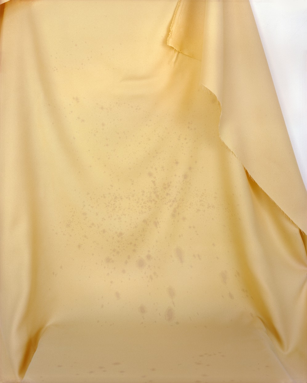 Stains reappear in the inkjet prints featured in the series Residual Loop (2013–2015). On display in the main gallery, Residual Loop depicts still lives of fabric hung along a flat background and above a square-faced surface. The fabrics in each print are unique—burnt orange silk charmeuse in one image, a royal blue satin in another—and draped with varying degrees of care and haphazardness. Some reveal the fabrics’ frayed and whiskered edges, roughly cut by unseen shears and hanging loosely off the rear wall; in others, the rough-hewn edges are blocked out of the image’s frame, giving the fabric the illusion of a continuous, smooth hang. Their soft sheen and elegant drape makes it clear that these are luxury fabrics, most likely used for eveningwear.