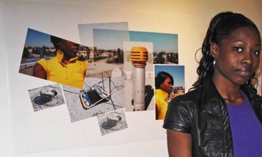 LeAndralynn Dunson. Artist standing with From the Rooftop, 2010; photo collage; installation view, Joyce Gordon Gallery, Oakland. Photo: R. Todd Kerr.
