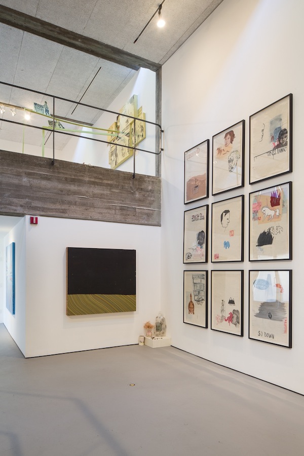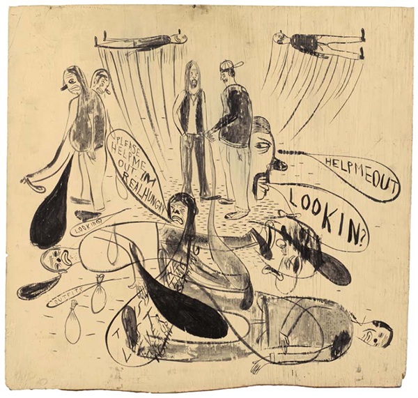 Alicia McCarthy and Ruby Neri are the standouts. A 1996 untitled (and rare) oil painting by McCarthy draws one in with its siren call of polychromatic, wavering lines woven into a hypnotic grid.2 Such Thing Countless Wondrs (1995), a group of nine works on paper by Neri, assembles a set of pictograms that seems to provide a lexicon for the rest of the show with its combination of animals, figures, and fonts. Also remarkable is the small group of Johanson’s mostly untitled acrylic-on-panel paintings from 1998. Dark sentiments about pain, failure, helplessness, and rage crowd the monochromatic works, in which figures are layered almost to the point of obliteration.