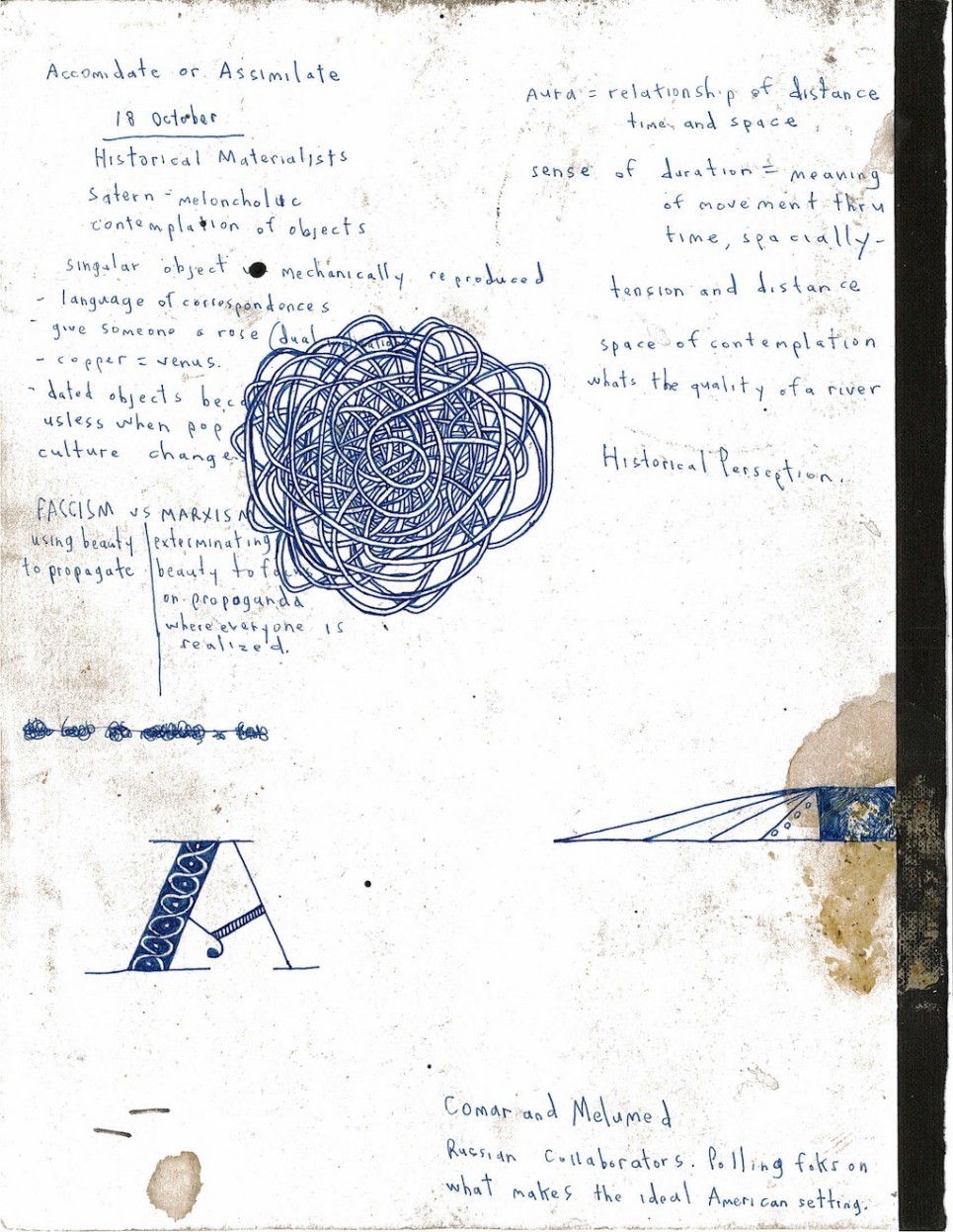 But the exhibition’s linchpin is tucked into one of the vitrines devoted to correspondence, snapshots, and other ephemera. It is a page from one of McCarthy’s sketchbooks, in which she paraphrases Walter Benjamin: “Aura=relationship of distance/time and space.”3 Benjamin laments the “passionate…inclination to bring things close” (emphasis his) that spurs reproduction but strips a work of its aura.4 For the group of artists represented in this exhibition, the capacity to encounter their work without the attendant baggage of the Mission School moniker is almost impossible. But bringing the artists back to the place where they were students both collapses and expands the distance around the work, historicizing it even as we encounter anew its vibrancy, earnestness, and disruptive spirit. The gap of twenty years is felt in the juxtaposition of paintings that are heartbreaking in their youthful fervor with those that are sober with the received wisdom of age.