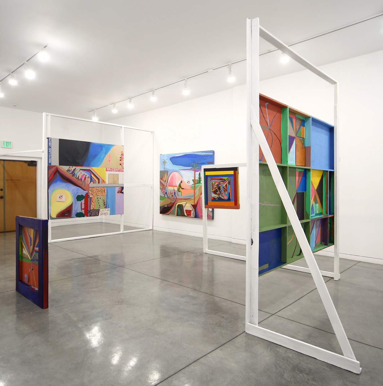 Given the cartoonlike basis of most of his portrayals, the slackerly compositions, and the seeming arbitrariness of the surface textures of the paint he uses so dynamically as a set of color choices (seemingly clumsy elements that have often been similarly deployed by other artists who might pass as “outsider,” however relative that term might be), the question arises as to why Johanson chooses to so often paint rather than draw. In these pieces Johanson doubles down on painting in several ways: first, through the large scale of several of the scenes, as with Lecture Series/Abstract Mass, and the bleak consumer composite suburbia of Los Angeles with Pills. Johanson paints on repurposed wood panels and displays most of his work in awkward, large, built wooden armatures to show off both fronts and backs equally (as he has done even more elaborately in installations elsewhere). This prominently shows off the wooden buttressing behind the panels, which he also highlights with “secondary” paintings on the reverse. These include what look like a series of painted geometric doodles mosaic’d on the back of one larger composition, a simple set of color fields of darker and lighter brown parceled out by the different wood elements themselves, and what looks like a beginning painted sketch of an abstract landscape not so dissimilar to what might show up elsewhere as just one among many background components in a “primary” or finished painting by Johanson on the front of one of his panels.