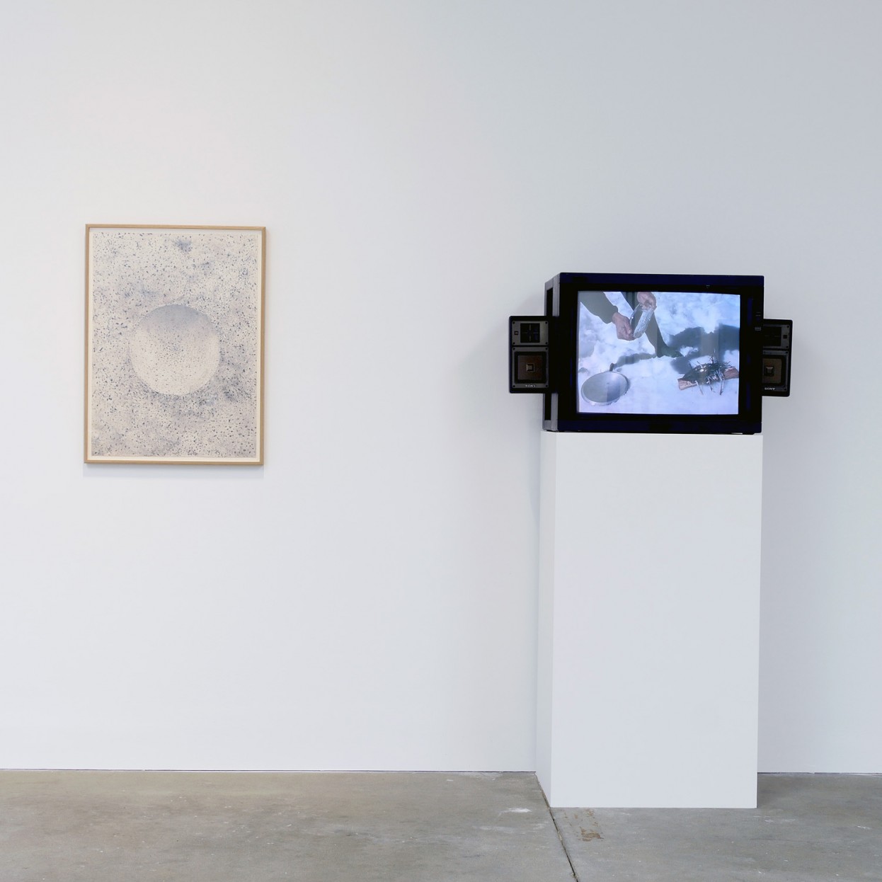 Paul Kos. Equilibrium: A Paul Kos Survey, installation view; The Drawing for a Tool: Ice Lens Maker, 1974; watercolor and ink; 30 x 22 in.; and Ice Makes Fire, 1974/2004; single-channel video, color, sound; 5:21. Courtesy of di Rosa, Napa. Photo: Wilfred J. Jones.