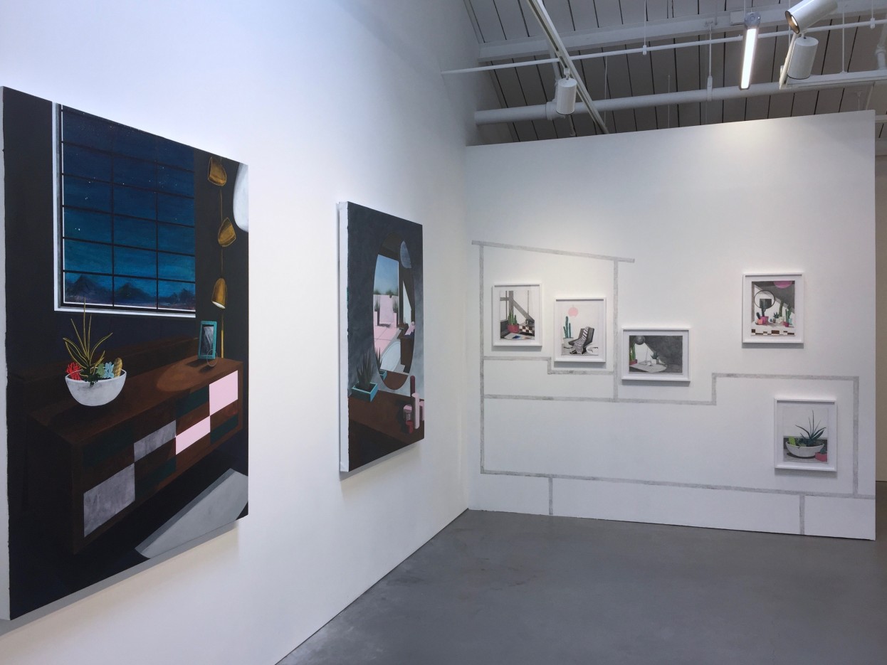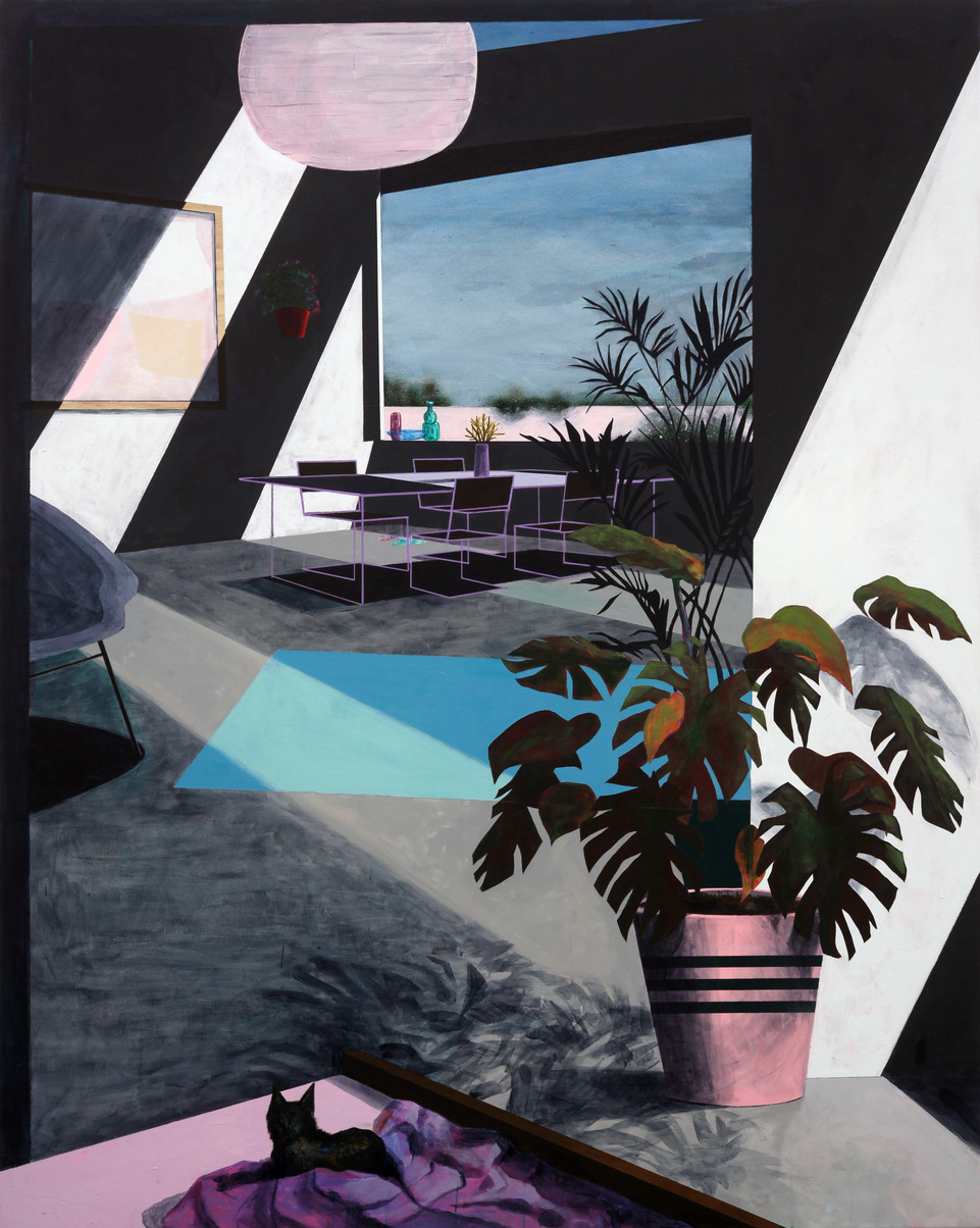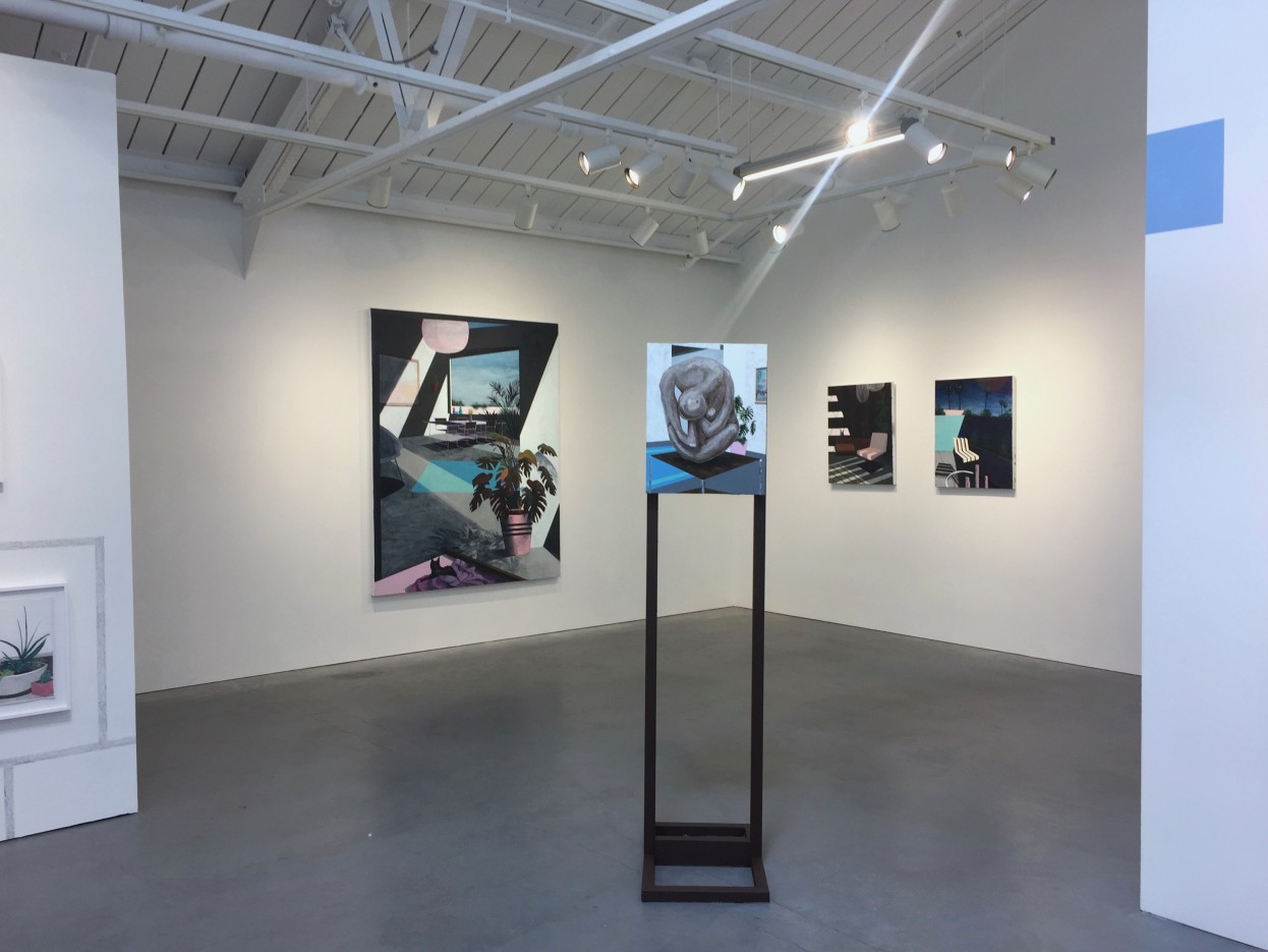 Nothing is as it seems in Erik Parra’s History by Choice at Eleanor Harwood Gallery. At first glance, the paintings of domestic interiors appeared so banal that I almost passed them by, but a faint, disquieting strangeness about the depicted spaces gave me pause. Chairs float, legless. Views of the outdoors beckon, but turn out to be mere reflections in mirrors. Shadows—which typically impart dimensionality—are so stark that they flatten entire scenes into blocks of color. Parra’s refusal of depth even extends to a would-be sculpture in the gallery’s center: a painting of a sculpture, comically installed on a pedestal like a three-dimensional object, and aptly titled Function Follows Form (2017).