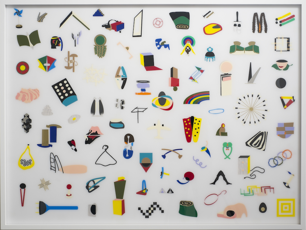 Mary Elizabeth Yarbrough. Lexicon 27, 2017; colored acrylic inlaid in white acrylic panel; 49 x 37 in. (framed). Courtesy of Bass & Reiner. Photo: Bass & Reiner.