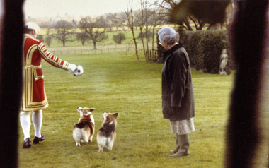 Alison Jackson. The Queen plays with her Corgies, from the series Confidential, 2007; chromogenic print; 16 x 12 in. Courtesy the Artist and M+B Gallery, Los Angeles. © Alison Jackson.