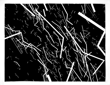 Similarly, the white-on-black drawings by the visual artist Marsha Cottrell and the conceptual architect Lebbeus Woods investigate relational dynamics through line and simple forms. In A Black Powder Rains Down Gently On My Sleepless Night (2012), Cottrell ephemerally depicts a whirlwind of motion where forms, suggestive of galaxies or flying saucers, swirl in vortices and sweep across the sky. In his series Conflict Space (2006), Woods employs graphic repetitive white lines and shapes to create spatial depth and explore permutation. Much like Allen’s series, Woods’s drawings operate as exercises in conceptual architecture, where the space between lines suggests the dynamics of process and iteration rather than rendering a constructible form.
