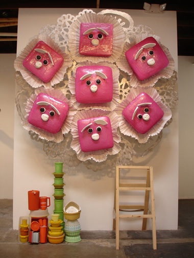 CAM: Lippire’s piece feels like too much of a puzzle to me. The pieces of the work are arranged by proximity, and it starts to feel unnecessarily symbolic. The elements aren’t just forms—there’s vintage Tupperware, there’s gigantic candies sculpted from raw materials with stupid fucking faces, and there’s a ladder; each one comes with specific social baggage. I have a hard time getting anywhere with it.